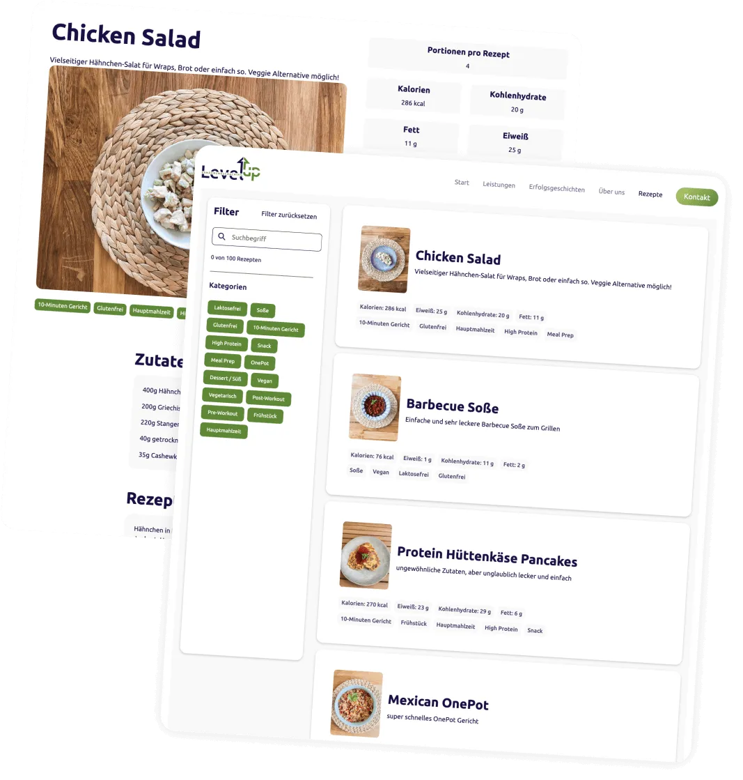 Für alle, die sich sportlergerecht ernähren möchten – ohne stundenlang in der Küche zu stehen, mit einfachen Zutaten aus dem Supermarkt und Rezepten, die auch der Familie schmecken: - Zugriff auf die umfangreiche Level-Up Rezeptdatenbank - Sportlergerechte Rezepte mit Fokus auf Performance & Regeneration - Familienfreundliche, schnelle & alltagstaugliche Gerichte - Inspiration für Meal Prep, Feierabendküche, proteinreiche Snacks & gesunde Süßigkeiten - Praxiserprobt aus dem Coaching-Alltag - Monatlich neue Rezepte – automatisch ergänzt - Einmalzahlung von 10 € - Dauerhafter Zugriff ohne Abo, kein Kleingedrucktes, kein Risiko